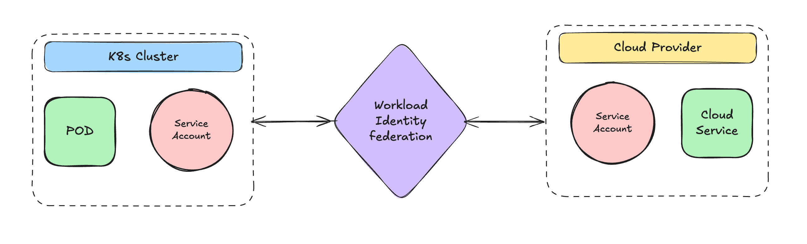 This is where workload identity comes in. It creates a trust relationship between your Kubernetes service accounts and cloud service accounts. Instead of storing cloud credentials in your cluster (which can be a security risk), workload identity allows pods to acquire cloud credentials dynamically based on their Kubernetes service account.